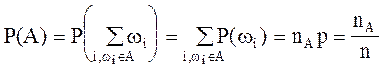 Вероятность любого события А, которому соответствует в пространстве элементарных событий некоторое подмножество А, содержащее nA исходов, определится следующим образом: А={wi},