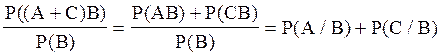 3. Если AÇC=Æ, то P((A+C)/B)=P(A/B)+P(C/B). Действительно, Р((А+С)/В)=