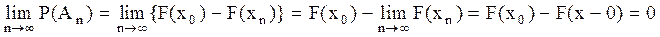 Доказательство. Выберем какую-нибудь возрастающую последовательность значений х1<x2<...<xn<..., сходящуюся к х0, т.е. хn®x0. Обозначим через Аn событие {xn£X£x0},т.е. Аn={xn £ X £ x0}. Ясно, что Аi Ì Aj, при i>j и произведение всех событий An есть невозможное событие - Æ. По аксиоме непрерывности при n ®¥ должно быть lim P (A n) =P (Æ) =0. С другой стороны