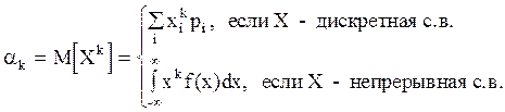 Начальным моментом k-го порядка распределения случайной величины Х (если он существует) называется действительное число ak, определяемое по формуле: