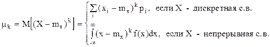 Центральным моментом k-го порядка распределения с.в. Х (если он существует) называется число mk, определяемое по формуле: