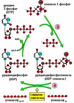 В начальных реакциях образуется УДФ-глюкоза (реакция 3), которая является активированной формой глюкозы, непосредственно включающейся в реакцию полимеризации (реакция 4).