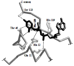 На рисунке 3.4 представлен активный центр рибонуклеазы А – фермента, гидролизующего молекулу РНК: