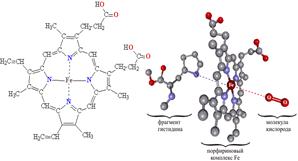 Ион железа четырмя координационными связями связан с азотами пирольных колец, пятая – связывает гемм с белком, шестая – образует связь с атомом кислорода. Каждая субьединица может связывать одну молекулу кислорода.