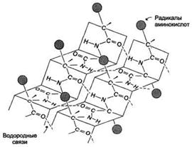 - в отличие от α-спирали, насыщенной водородными связями, каждый участок полипептидной цепи в β-структуре открыт для образования дополнительных водородных связей.