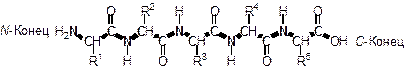 Рис. 1.15 Пентапептид (пептид из пяти аминокислотных остатков). R1, R2 и т.д. — боковые радикалы аминокислот. Пептидный остов молекулы выделен утолщенными линиями.