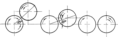 Мелющие вальцы располагаются под углом к горизонту в 20° и горизонтально (рис. 3.). Чем меньше угол наклона вальцов, тем благоприятнее условия подачи материала в зону измельчения, но ширина вальцового станка при этом несколько увеличивается.