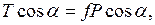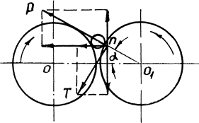В момент вхождения в щель частица в точке соприкосновения п воспринимает давление вальца Р, возникающая при этом сила трения T=fP направлена по касательной (на рисунке показаны силы, действующие со стороны только одного вальца)
