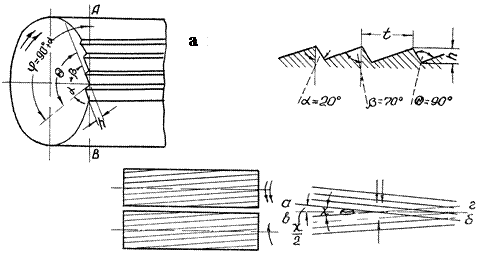 определяется из условий резания двумя пересекающимися рифлями аб и вг (рис.6, г).