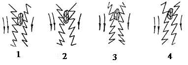 В вальцовых зернодробилках на эффективное измельчения большое влияние оказывает расположение режущих граней рифлей по отношению к частицам материала. Возможны четыре варианта расположения рифлей (рис. 7). При варианте 1 измельчаемая частица поддерживается режущей гранью медленно вращающегося вальца и измельчается режущей гранью быстро вращающегося вальца. Такое расположение рифлей (острие по острию) создает условия, при которых частицы разрушаются в основном в результате срезания или скалывания на крупку. При вариантах 2 - «острие по спинке» и 3 - «спинка по острию» частицы больше растираются, и выход муки увеличивается. При варианте 4 - «спинка по спинке» имеют целью получить наибольший выход муки. Для дробления кормов наиболее целесообразным является 1 вариант взаиморасположения рифлей на парноработающих вальцах.