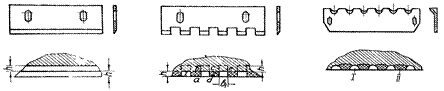 Плоский нож со сплошным лезвием (рис. 40., а) способен давать стружку в виде широких ломтей толщиной h, зависящей от установки ножа относительно плоскости, диска или барабана, шириной b, равной ширине продукта, и длиной l, достигающей длины частиц продукта. Такая форма и размеры стружки соответствуют требованиям кормления крупного рогатого скота.