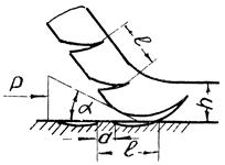 (рис11..), внедряясь в материал, под действием силы Р сжимает стружку на пути а. Затем, когда сила Р достигает определенной величины, происходит скалывание элемента стружки длиной l, которая всегда больше пути сжатия а. После этого процесс повторяется. Исследованиями установлено, что линии скалывания элементов стружки опережают лезвие клина и сначала углубляются в толщу материала, а затем направляются вверх. В результате того, что линии скалывания не доходят до наружной поверхности, стружка остается связанной. Длина элементов стружки увеличивается с увеличением толщины стружки h и угла заточки ножа сх и почти не зависит от скорости резания и толщины лезвия ножа.