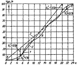 Регулирующий объем бака определяется на основании данных расхода воды потребителями и подачи ее насосной станцией. На рисунке 1.25 приведен интегральный график водопотребления 1, совмещенный с графиками подачи воды насосом при круглосуточной равномерной работе насосной станции 3 и при равномерной работе ее в течение 16 ч в сутки (с 4 до 20 ч). При построении кривой 1 по оси абсцисс откладывают часы, а по оси ординат – В суммарные объемы воды и почасовой расход, выраженные в процентах от соответствующих суточных значений. Далее, задав режим и количество часов работы насосной станции в сутки (прямые 2 и 3 на рис. 1.25), наносят на этот же график интегральную кривую подачи воды насосами, соответствующую равномерной работе станции за сутки или за 16 ч.