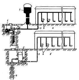а – с водонапорной башней; б – с пневмогидроаккумулятором (автоматической водокачкой); 1 – водоструйная установка; 2 – водонапорная башня; 3 – водопровод; 4 – автопоилки; 5 – пневмогидроаккумулятор (воздушно-водяной котел); 6 – реле давления; 7 – станция управления; 8 – погружной электронасос