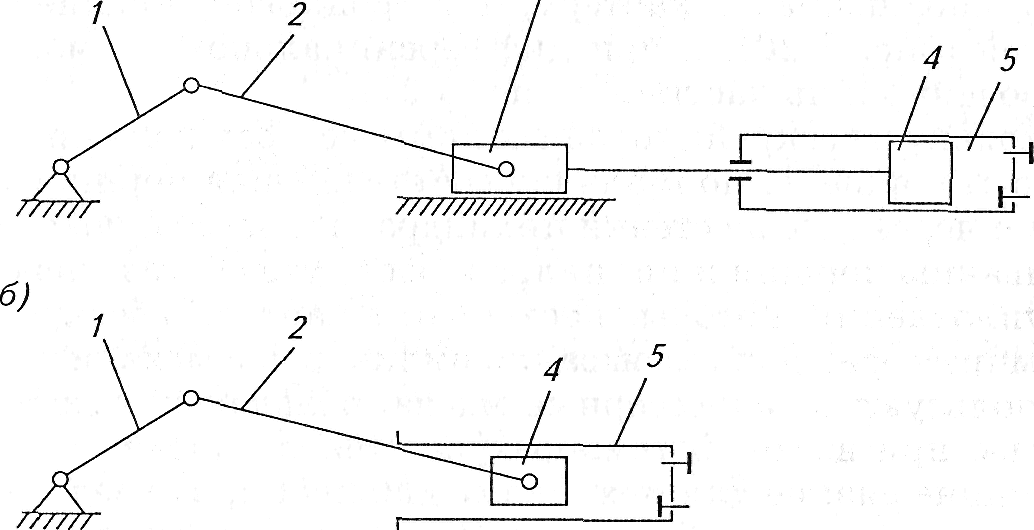 1 — кривошип; 2 — шатун; 3 — ползун (крейцкопф); 4 — поршень; 5 — цилиндр склапанами