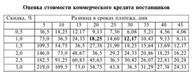 Допустим, рассматривается альтернатива: либо рассчитаться к 100му дню и получить за это 1,0%-ную скидку, либо рассчитаться к 300му дню (разумеется, потеряв возможность воспользоваться скидкой). Разница в сроках расчетов составит 20 дней (30 – 10). На пересечении соответствующих граф табл. 3.6 можно увидеть цену отказа от возможности воспользоваться скидкой, которая и будет характеризовать в данном случае стоимость коммерческого кредита поставщиков.