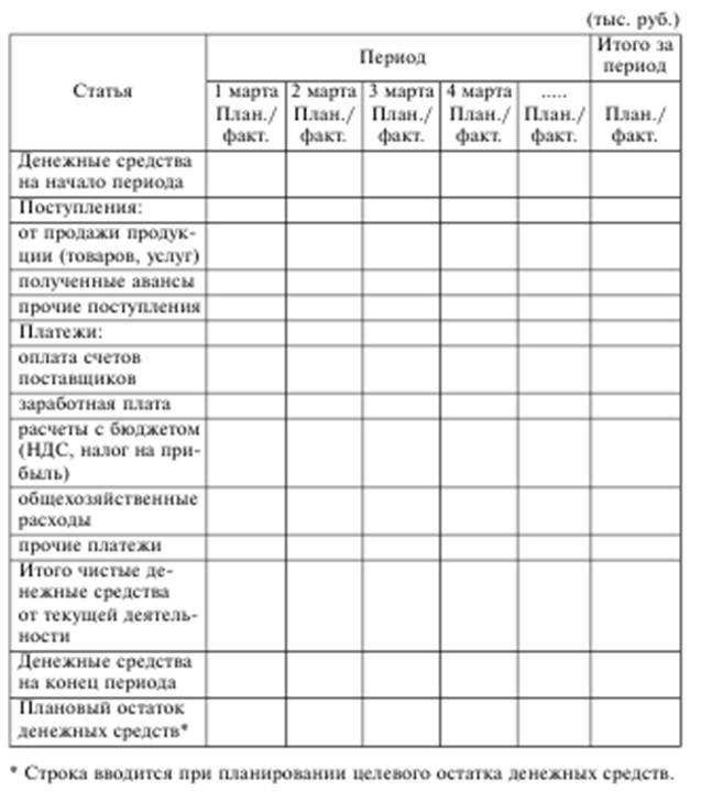Платежный календарь может иметь различную структуру, но в нем обязательно должны найти отражение все суммы ожидаемых поступлений и платежей, а также планируемые остатки денежных средств в разрезе выбранных временных периодов. Примерный формат платежного календаря применительно к текущей деятельности представлен в табл.1.