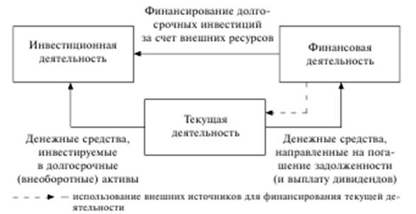 Рис.4. Взаимосвязь денежных потоков от текущей, финансовой и инвестиционной деятельности