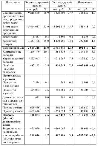 При вертикальном анализе, или анализе структуры, отчета о прибылях и убытках необходимо дать оценку удельному весу отдельных составляющих отчета в величине выручки от продаж. При этом самостоятельное аналитическое значение имеют следующие важнейшие показатели: