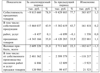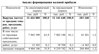 Анализ валовой прибыли. В процессе анализа следует обращать внимание на изменение и процентного значения показателя, и абсолютной величины валовой прибыли. В случае роста выручки от продаж продукции, даже если процентное значение рассматриваемого показателя снизилось, может быть обеспечена необходимая сумма валовой прибыли. Напротив, тенденция снижения процентного значения показателя при сохраняющемся объеме продаж может привести к сокращению прибыли от продаж продукции и ее недостаточности в будущем (в данном случае при сохраняющемся объеме продаж имеет место рост расходов).