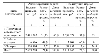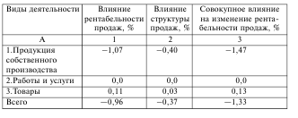 Данные по строкам отражают влияние отдельных сегментов на общее изменение рентабельности продаж компании. Данные по графам характеризуют влияние отдельных факторов: рентабельности продаж отдельных сегментов и их структуры.