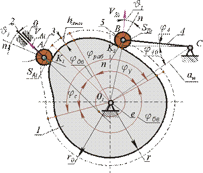 На рис. 4.6 изображена схема плоского кулачкового механизма с двумя видами выходного звена: внеосным с поступательным движением и качающимся (с возвратно-вращательным движением). На этой схеме указаны основные параметры плоских кулачковых механизмов.