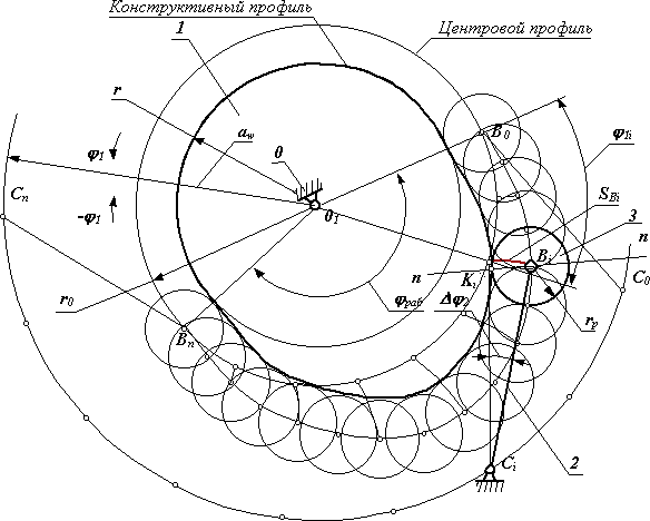 · конструктивный профиль кулачка получаем как огибающую к множеству положений ролика толкателя.