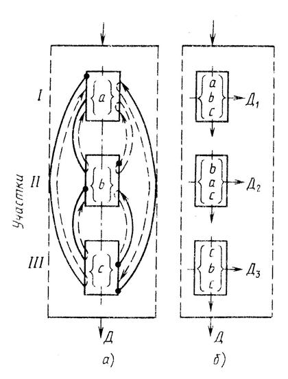 На схеме, условно показаны три участка, каждый из которых сформирован из станков одинакового технологического назначения. Указанные станки могут принадлежать к одной группе или к разным размерным группам. При такой структуре возникают многочисленные прямые и обратные внешние связи между технологически специализированными участками для изготовления множества деталей Д.