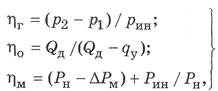 Для объемных насосов, как и для динамических, различают гидравлический ηг, объемный ηо и механический ηм КПД, учитывающие три вида потерь энергии: