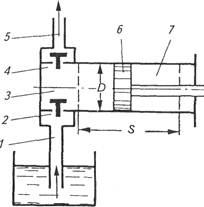 Схема одноцилиндрового поршневого насоса одностороннего действия показана на рис. 3.1. Насос состоит из цилиндра 7, в котором размещен поршень 6 со штоком; клапанной коробки 3, в которой установлены всасывающий 2 и нагнетательный 4 клапаны. К клапанной коробке присоединены всасывающий 1 и нагнетательный 5 патрубки.