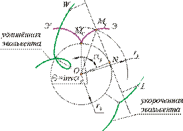Рис. 2.4 | Свойства эвольвенты окружности: Форма эвольвенты зависит от радиуса основной окружности. Нормаль к эвольвенте является касательной к основной окружности. Центр радиуса кривизны находится на основной окружности. Эвольвента имеет две ветви и точку возврата М0. Эвольвента не имеет точек внутри основной окружности. Точки связанные с производящей прямой но не лежащие на ней при перекатывании описывают: точки расположенные выше производящей прямой L - укороченные эвольвенты, точки, расположенные ниже производящей прямой W - удлиненные эвольвенты. |