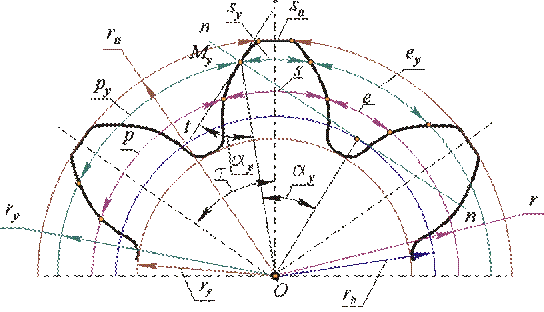 Шаг колеса делится на толщину зуба sy и ширину впадины ey. Толщина зуба sy - расстояние по дуге окружности ry между разноименными точками профилей зуба. Ширина впадины ey - расстояние по дуге окружности ry между разноименными точками профилей соседних зубьев.