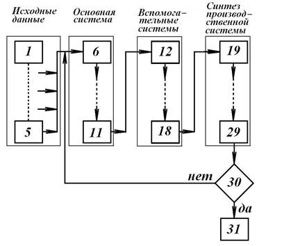 19 – разработка производственных маршрутов изготовления изделий; 20 – выбор принципов формирования производственных подразделений; 21 – выбор состава производственных подразделений; 22 – расчет состава и количества технологического оборудования в производственных подразделениях; 23 – расчет производственной площади производственных подразделений; 24 – расчет производственной площади цеха и его габаритных размеров; 25 – компоновка цеха; 26 – планировка оборудования в производственных подразделениях и в цехе; 27 – расчет состава и количества работающих в производственных подразделениях и в цехе; 28 – окончательное формирование материальных, энергетических и информационных потоков; 29 – расчет технико-экономических показателей.