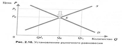 Предположим, что фактическая цена (P1), установившаяся на рынке, превышает по какой-либо причине цену (Ре) равновесия (рис. 2.10). Возникает избыток предложения, приводящий к понижению рыночной цены.