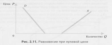 Модель рынка свободных благ. На рынке свободных благ при любой положительной цене объем предлагаемого блага будет больше величины спроса на него. Другими словами, равновесие достигается уже при нулевой цене (рис. 2.11). Примером такого рынка с определенной степенью условности может служить рынок бездомных котят. Чтобы пристроить такого котенка «в хорошие руки», надо еще и приплатить.