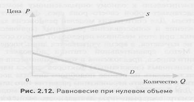 На рынке товаров, производство которых технически возможно, но экономически нецелесообразно в силу чрезмерных издержек, равновесие достигается при нулевом объеме выпуска, поскольку при любом положительном объеме производства цена производителя, определяемая его издержками производства, будет выше цены спроса (рис. 2.12). Сравнительно недавно к таким рынкам можно было отнести космический туризм.