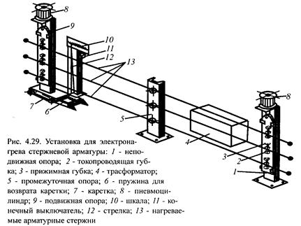 – электрический, при котором арматурные стержни нагревают электрическим током с целью получения определенного удлинения. Уложенные в таком состоянии в форму на упоры они при остывании укорачиваются и в них возникают необходимые натяжения;