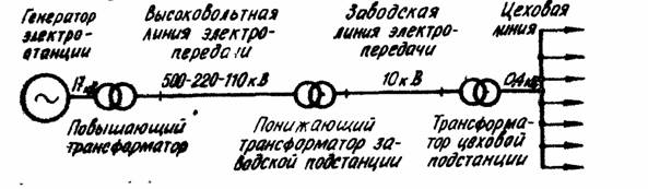 Распределение электрической энергии между промышленными предприятиями, населёнными пунктами, в городах и сельских местностях, а также внутри промышленных предприятий производится по воздушным и кабельным линиям, при напряжении 220, 110, 35, 20, 10 и 6 кВ. Следовательно, во всех распределительных узлах должны быть установлены трансформаторы, понижающие напряжение до величины 220, 380 и 660 В (рис. 1.1)