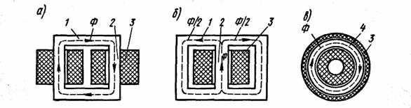 Магнитная система. В зависимости от конфигурации магнитной системы, трансформаторы подразделяют на стержневые (рис. 1.3, а), броневые (рис.1.3, б) и тороидальные (рис. 1.3, в).