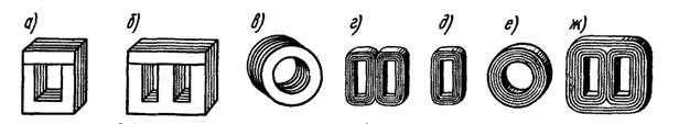 Широкое применение получили магнитопроводы, навитые из узкой ленты электротехнической стали или из специальных железоникелевых сплавов типа пермаллой. Их можно использовать для стержневых, броневых, тороидальных и трёхфазных трансформаторов (рис 1.4 г, д, е, ж).