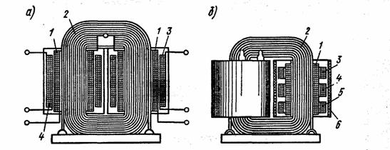 Обмотки. В современных трансформаторах первичную (рис. 1.5; 1) и вторичную (рис. 1.5; 3, 4, 5) обмотки стремятся расположить для лучшей магнитной связи как можно ближе одну к другой. При этом на каждом стержне магнитопровода (рис. 1.5; 2) размещают обе обмотки либо концентрически – одну поверх другой (рис. 1.5 а), либо в виде нескольких дисковых катушек, чередующиеся по высоте стержня (рис. 1.5 б). В первом случае обмотки называют концентрическими, во втором – чередующимися. В силовых трансформаторах обычно применяют концентрические обмотки, причём ближе к стержням располагают обмотку НН, требующей меньшей изоляции относительно остова трансформатора, а снаружи – обмотку ВН.