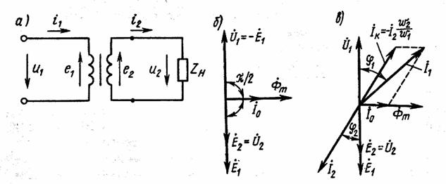 Предположив, что насыщение в стали трансформатора отсутствует и весь магнитный поток замыкается по стальному магнитопроводу, можно считать ток первичной обмотки идеализированного трансформатора прямо пропорциональным магнитному потоку. В связи с этим, на векторной диаграмме идеализированного трансформатора в режиме холостого хода (рис 1.6,б) ток холостого хода Í10 изображён вектором, совпадающий по направлению с вектором магнитного потока.