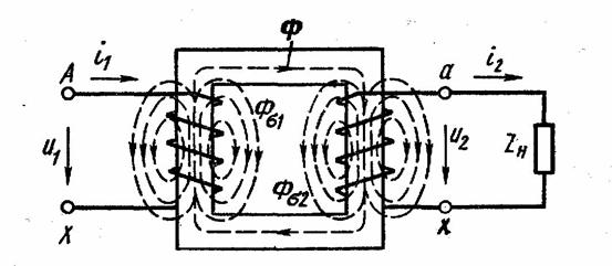 В реальном трансформаторе помимо основного магнитного потока Ф, замыкающегося по магнитопроводу и сцепленного со всеми обмотками трансформатора, имеются также потоки рассеяния Фσ1 и Фσ2 (рис 1.7), которые сцеплены только с одной из обмоток. Потоки рассеяния не участвуют в передаче энергии, но создают в каждой из обмоток соответствующие ЭДС самоиндукции