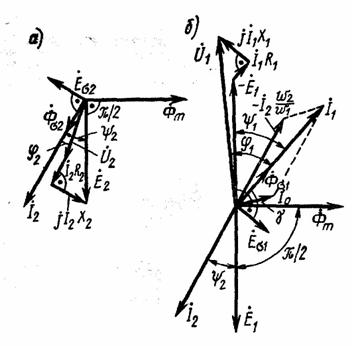 Векторную диаграмму вторичной обмотки трансформатора (рис. 1.8, а) строят согласно уравнению (1.23). Характер диаграммы определяется током нагрузки Í2, который принимается заданным по величине и фазе. Иными словами, задаваясь векторами вторичного тока Í2 и напряжения Ú2, можно построить вектор ЭДС