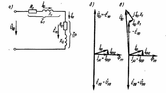 Векторная диаграмма трансформатора в режиме холостого хода, построенная исходя из указанных выше допущений, изображена на рис. 1.11, б. В действительности ток Í10 создает в первичной обмотке падения напряжения Í10 R1 и j Í10 X1, поэтому