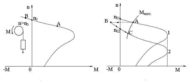 Пусть двигатель с заданной нагрузкой на валу работал в точке A (рис. 2.25.а). Если под действием опускаемого груза ротор начнет вращаться быстрее магнитного поля и рабочая точка попадает в точку B, то n в> n 0, машина будет развивать тормозной момент и частота вращения снизится до величины меньшей n 0. Одно из достоинств генераторного торможения у асинхронных машин заключается в том, что переход в режим генератора происходит автоматически, как только ротор начинает вращаться быстрее магнитного поля. Это защищает асинхронные двигатели от аварийной ситуации, которая может наступить у двигателей постоянного тока. Асинхронные двигатели не могут пойти в разнос. Максимальная частота вращения ротора ограничивается частотой вращения магнитного поля.
