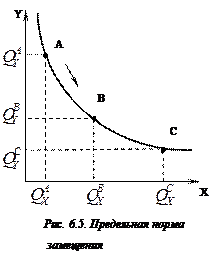 Из данной формулы вытекает, что предельную норму замещения товара Х товаром У можно выразить как отношение их предельных полезностей. Таким образом, предельная норма замещения отражает степень важности для потребителя одного товара относительно другого и его готовность отказаться от первого ради приобретения дополнительной единицы второго. На графике это можно представить следующим образом. В точке «А» на графике (6,5) по оси ординат отражено состояние потребителя, при котором он имеет незначительное количество единиц товара Х относительно единиц товара