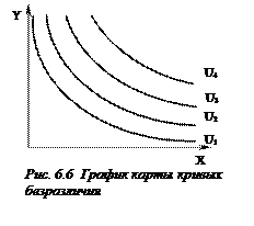 Предельная полезность данного товара зависит не только от его количества, но и от количества всех имеющихся товаров. Так, предельная полезность яблок будет зависеть как от их количества, так и от наличия многих других фруктов. Соотношение полезности двух товаров можно представить в виде кривых безразличия, которые отражают объективную информацию о субъективных предпочтениях, отдаваемых потребителем продукту А или продукту В. Кривые безразличия представляют совокупность точек, которые отражают альтернативные комбинации двух товаров, приносящих одинаковое удовлетворение, и к выбору которых покупатель безразличен. Кривая безразличия имеет отрицательный наклон. Это обусловлено тем, что оба продукта обладают полезностью для потребителя, но при этом соблюдается условие, что увеличение потребления товара Х неизбежно сопровождается некоторым сокращением товара У, ведущее к сохранению общего уровня полезности. Поскольку между этими величинами существует обратная связь, то графически она должна предстать линией нисходящего вида имеющей отрицательный наклон. Кривые безразличия в подавляющем большинстве случаев выпуклы к началу координат, это означает, что они становятся более пологими по мере роста потребления одного из благ. Однако не все кривые имеют такой вид, есть немалое число исключений.