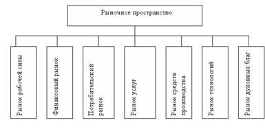 Рынок представляет собой систему со своей внутренней структурой, иерархией отдельных элементов и взаимосвязями. Рыночное пространство складывается из самостоятельных, хотя и связанных между собой рынков (рис.1.1).