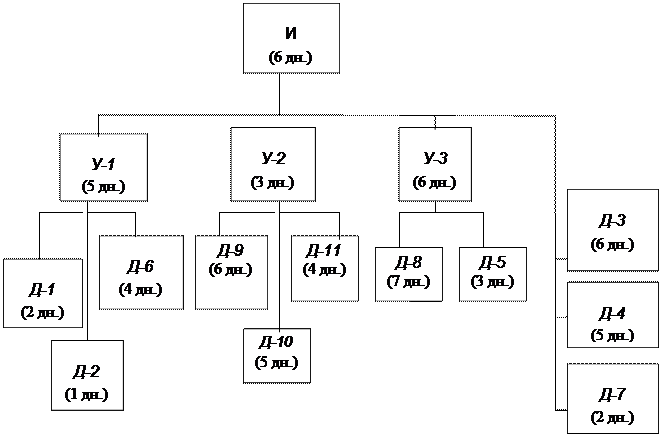 Цикловой график построен для условий, когда изготовление деталей и сборка не лимитируются составом оборудования цехов, т.е. возможна максимальная параллельность работ. Длительность в этих условиях будет минимальной. Однако условия производства могут потребовать выполнения некоторых работ последовательно. Например, если сборка узлов У-2 и У-3 будет вестись на одном и том же стенде, то это приведет к увеличению длительности производственного цикла.